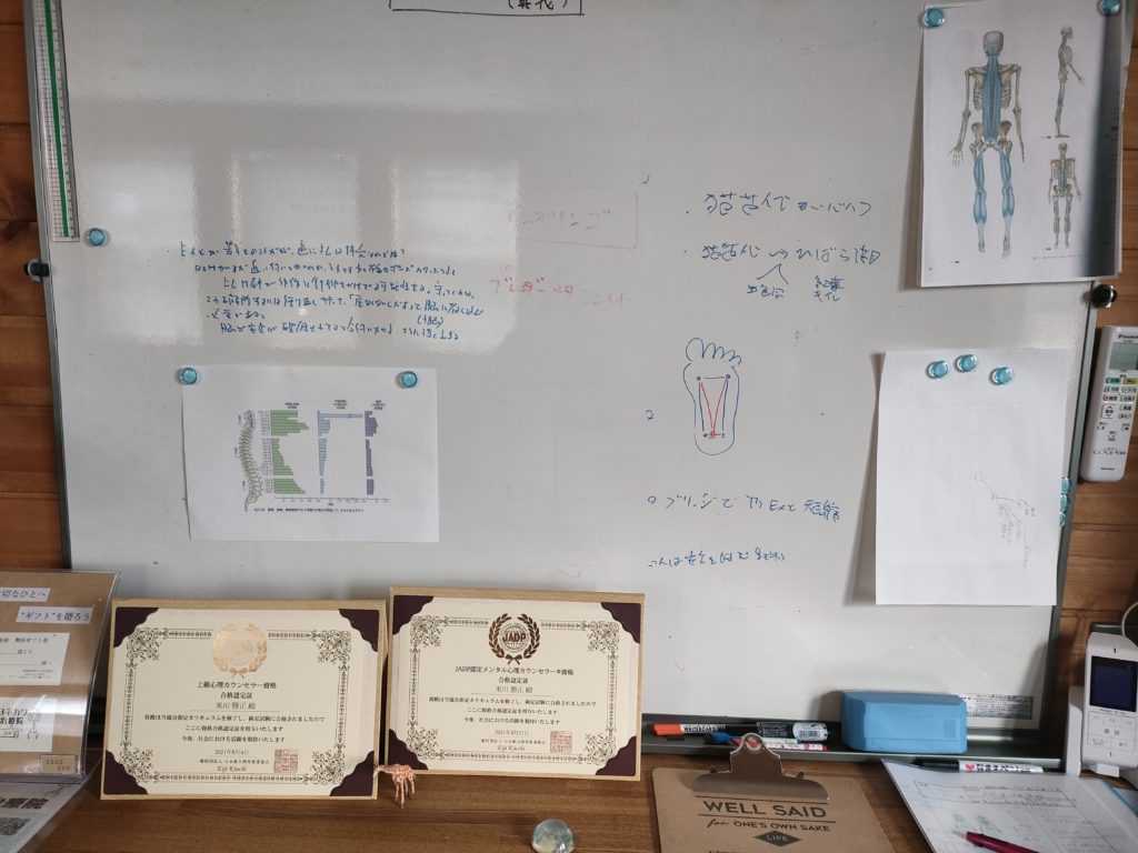 治療院の壁には大きなホワイトボードが設置してあります。
