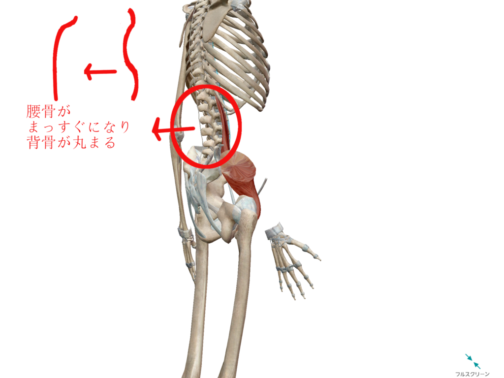 腰の骨の反りが弱まり、背中の丸まりに繋がります。